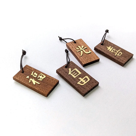 Kanji Mini Talisman – handgefertigter Holz Anhänger Glücksbringer mit vergoldeter Lederprägung